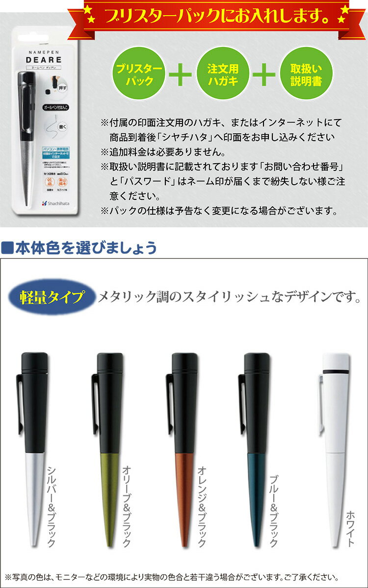 ギフト対応シヤチハタ 名入れネームペン DEARE(ディアレ) 【メールオーダー式】 メーカー シヤチハタ株式会社 本体ついて 本体の大きさ/17.5×21.2×127.1mm 本体の重さ/約14.8g 印面のサイズ/直径9mm ペン部分/ボール径0.7mm(黒)回転式 品 番 ◆シルバー&ブラック NP-DRA1/MO ◆オリーブ&ブラック NP-DRB1/MO ◆オレンジ&ブラック NP-DRB2/MO ◆ブルー&ブラック NP-DRB3/MO ◆ホワイト NP-DRC1/MO 印面のインキ色 全6色より選択 ※朱色が標準色です ※モニターなどの環境により実物の色合と若干違う場合がございます。